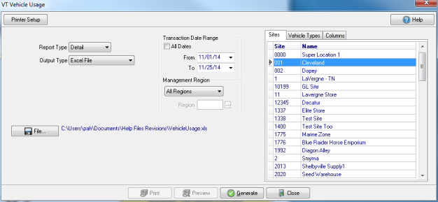The Vehicle Usage report provides information on the Expenses and Revenue related to Vehicles. Create a Summary or Detail report that can be generated as a Report or export to MS Excel. Create a Date Range and specify All, one or multiple Management Regions.