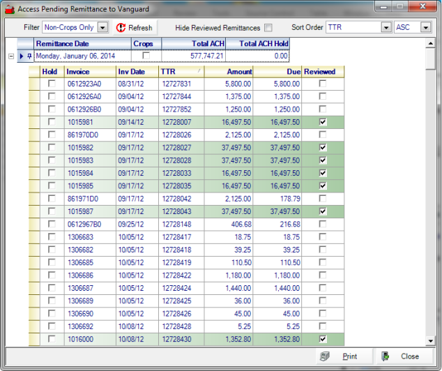 The details of all pending remittances to a distributor using the Vanguard Agsoftware are listed. Each invoice can be marked as reviewed which will remove it from the grid if Hide Reviewed Remittances is selected. Invoices can also be placed on hold which will exclude them from the ACH file to the distributor.
