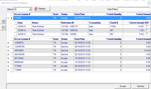 Expand the checks listed associated with a driver license number by clicking the plus sign to the left of the DL number. Use the checkbox in the NSF column to indicate a bad check. This indicates a bad check but does not prevent additional checks associated with the DL from being accepted.