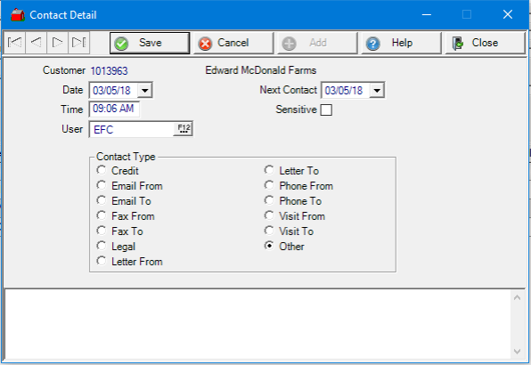 Record who made the contact by entering a User ID in the User field. Select F12 to search if the current user did not create the contact.
