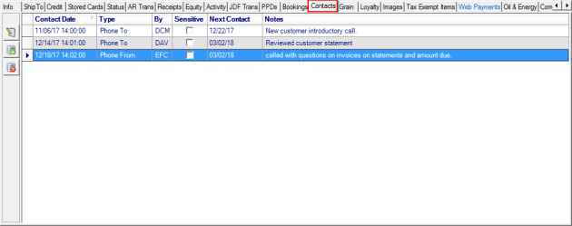 Contacts provides the ability to view, edit or create communication with a Customer regarding their account. Contacts can be created within a Customer account or by using the Enter Customer Contacts menu.