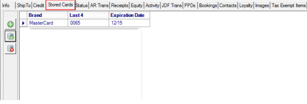 Grant permission to User Profiles in Access User Profiles > select a User Profile > Menu Security > Accounts Receivable module > Access Customers > Stored Cards. |
