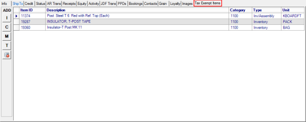 Add items, item categories, or items from a specific manufacturer to the Tax Exempt Items tab to exclude the customer being assessed sales tax. See Tax for setting tax exemptions by state for the customer.