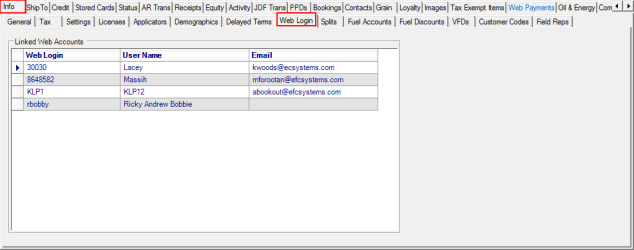 Locations using the Merchant Ag Portal will display the Web Logins associated with the account. See Access Customer Web Logins for information on creating Web Logins.