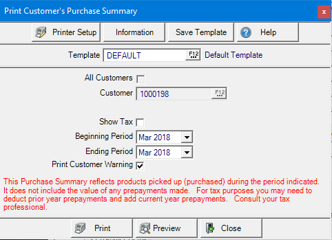 When Print Customer Warning is selected, the text that appears below prints on the Purchase Summary Statement.