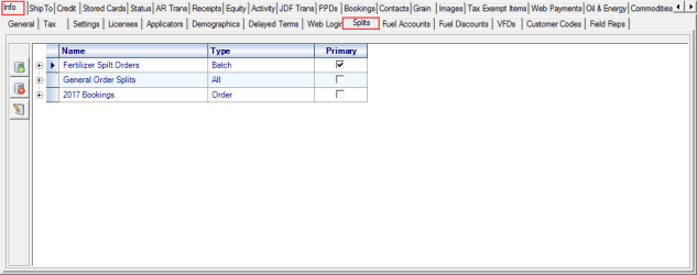 Location can create a traditional customer split by access the Info Splits tab within the customer account which will display any existing splits. The account used to create the Split is flagged as the Primary account and any change to the split can be entered. A