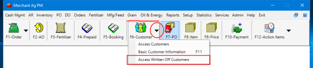 Select AR > Access Written Off Customers to search for any Customer account with the Status set to Write Off. Written Off accounts are excluded from most Customer searches and all Accounts Receivable reports with the exception of the Written Off Accounts report. Written Off Customer accounts can also be accessed using the drop down menu available with F6-Customers icon.