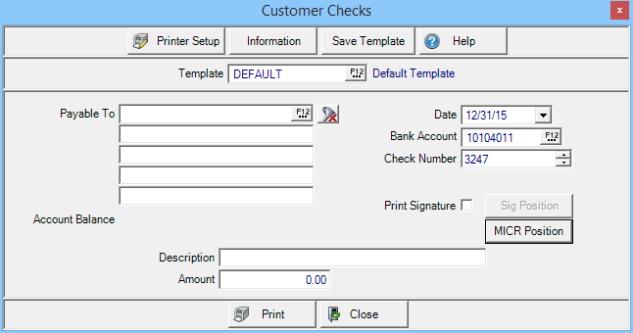 MICR Position is available if using blank check stock to create MICR checks. The MICR Position button will indicate the position the MICR line will print on blank check stock. The option to create MICR checks should be set in Merchant Ag FIN > CM > Access Bank Accounts > Check Writing.