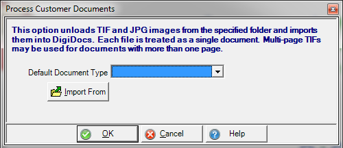 Available when Digidocs AR integration is implemented. Imports image files from the specified directory which can then be associated with customer accounts. A default document type can be set based on what is defined in Digidocs.