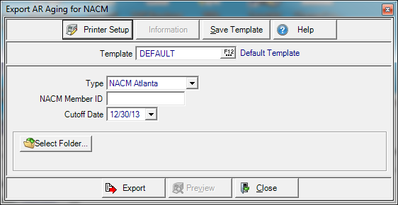 Exports the Accounts Receivable Aging to one of three credit entities. For customer accounts to be included, select the NACM Reportable checkbox found in customer accounts on the Settings tab.