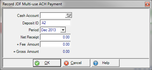 Accounting Note: This transaction creates a Journal Entry, transaction type FR, that debits the selected Cash Account, credits the JDF Receivables account and debits the JDF Fee Expense account. Both JDF accounts are set in Merchant Ag FIN within Installation Parameters and the JDF tab within the AR menu.