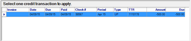 Use the Select one credit transaction to apply section to choose the payment(s) to be applied by clicking on it. When accessing from F10 Customer payments, the payment just entered will be listed. From the AR Trans tab, all unapplied payment(s) are listed.