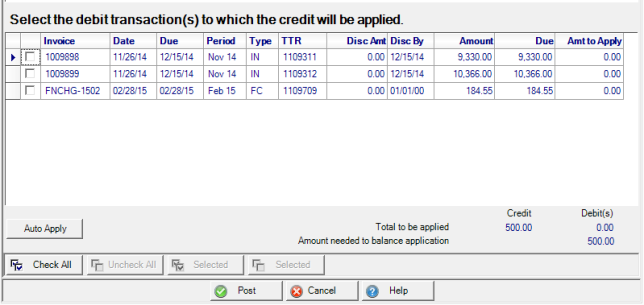 Select the debit transaction(s) to which the credit will be applied lists all outstanding invoices for the account.
