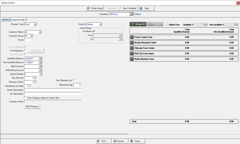 After Patronage checks are written, Equity checks can be generated for Qualified or Non-Qualified Reserve or distributed by percentage to oldest first.