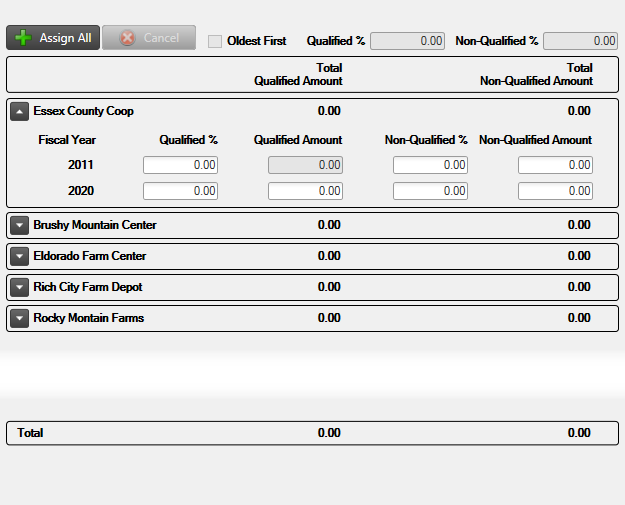 Click the Oldest First checkbox to enable the Qualified and Non-Qualified percentage fields. Enter the percentage in either or both fields to apply to each eligible member beginning with the oldest Fiscal Year first. Click