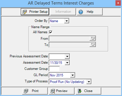 - Proof Run (No Updating) - Select to review the accounts and delayed terms interest amount charged.