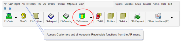 Find all Accounts Receivable functions by selecting the AR menu. Focus on just Customer accounts by selecting the Customers icon or use the F6 function key. Select the menu title to learn more about each option available.
