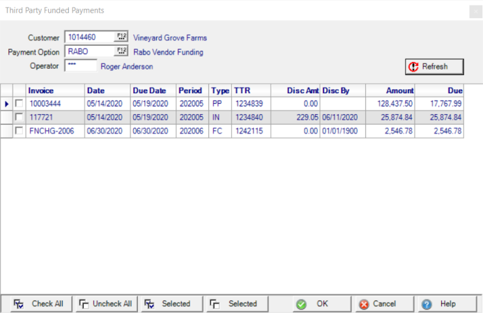 Select the Customer account by entering the ID or use F12 to search the choose the Payment Option by entering the Payment Option ID or use F12 to search. Provide the Operator ID and click Refresh to load transactions to the grid.