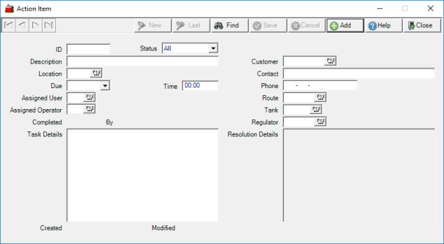 The Route, Tank and Regulator fields can be used to create a Action Item for Oil & Energy. Select a Route, Tank and Regulator or select F12 to search in any field and indicate the Task details.