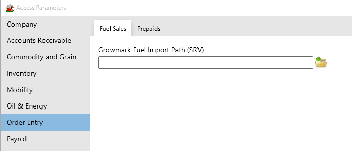 Use Growmark Fuel Import Path (SRV) to enter the Growmark Fuel Import Path that will be used to retrieve the import file. When entered, Growmark becomes an available format in Orders > Import Fuel Sales > as a format.