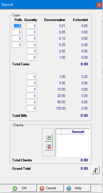 Click to compare the tally entered to the Drawer Total displayed. The Grand Total displays the total for the Cash and Checks entered in the Deposit Tally.