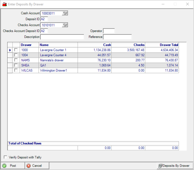 Select the drawer(s) to be included in the deposit by selecting the checkbox to the left of the Drawer ID. As drawers are selected, the Totals of Checked Rows at the bottom of the grid updates.