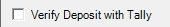 Manually enter totals for the deposit by selecting Verify Deposit with Tally then select to open the Deposit tally window and enter the cash and checks for the deposit. Complete the Deposit by selecting OK in the Deposit Tally to finalize the deposit.