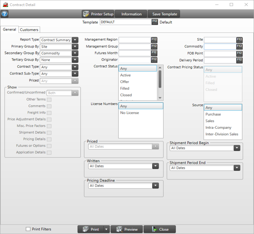 Contract Pricing Status is active when the Report Type is Pricing Summary or Pricing Detail and select Any, Active, Filled or Closed.