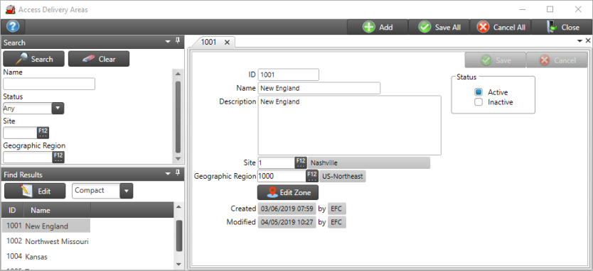 Create a Delivery Area to be referenced in Freight Points. Use Search to find existing Delivery Areas or select Add to create a new Area. Creating Delivery Areas should be completed after Geographic Regions when using the Freight function.