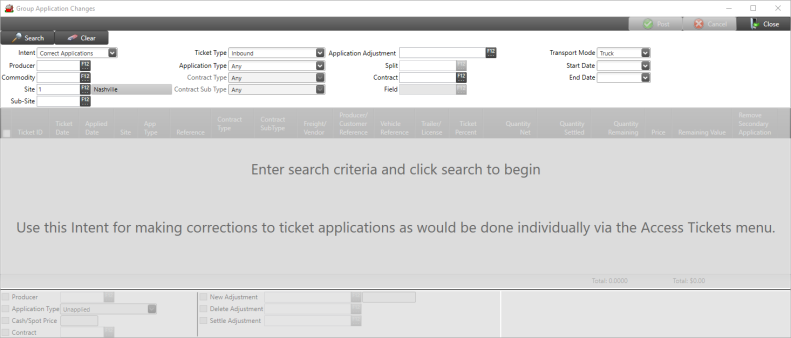 Unapplied tickets from multiple producers can be updated by using Change Applications by setting the filter Ticket Type to Inbound and select the Application Type of Unapplied and click Search. A Site is not required for this search.