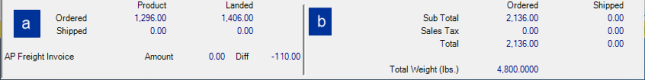 Shipped | Displays Order quantity multiplied by Vendor Cost for Shipped Items. | Product Total plus allocated freight for Shipped Items. |