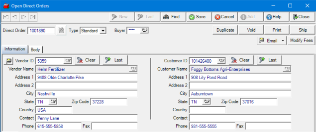 Select the Vendor and Customer for the DO by entering the Vendor and Customer ID, select F12 to search or use the Last button to retrieve the previous Vendor or Customer. Use the Clear button to remove either selection.