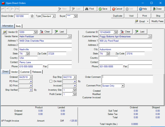Vendor- The Vendor tab will be used to set the Freight options for the Direct Order.