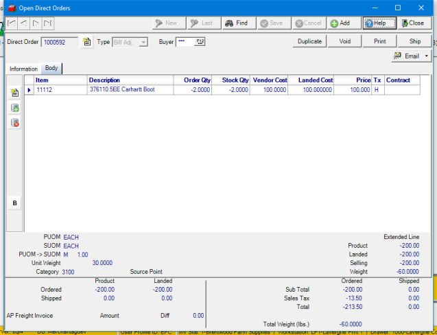 A Billing Adjustment Direct Order is a method of adjusting the AP invoice and amount settled to the Customer account for Items returned to a vendor. A Billing Adjustment is entered like a Standard Direct Order with the exception the quantities are entered as negative amounts.