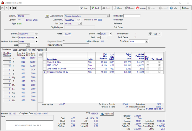Grant permission to User Profiles in Access User Profiles > select a User Profile > Security > Fertilizer Blending > Main Menu > Access Closed Batches. |