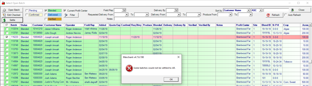 If a batch can't be settled for any reason, a message appear that a batch(es) can't be settled and will be highlighted on the Access Dispatching grid with red.