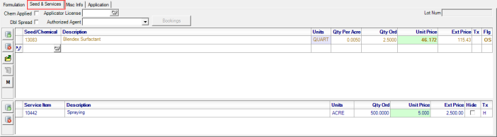 Use the Applicator License field for Chemicals that will be spread by an applicator instead of the customer, enter the Applicator License ID or select F12 to search. See Select an Applicator License for more details.
