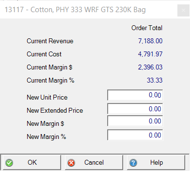 Use the new value entered, the values for the other fields are calculated. For example, entering a New Unit Price will calculate the New Extended Price, New Margin $ and New Margin %.