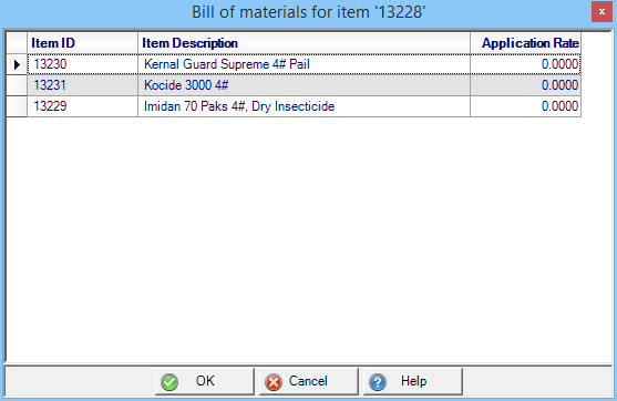 Click to Load Kit Items BOM. For chemical kit items, load the components of the Bill of Materials for the Item. For Item's with a zero application rate, enter the appropriate chemical for the crop by entering the Application Rate and select OK. See Item Detail > Misc > Fertilizer to learn more about application rates.