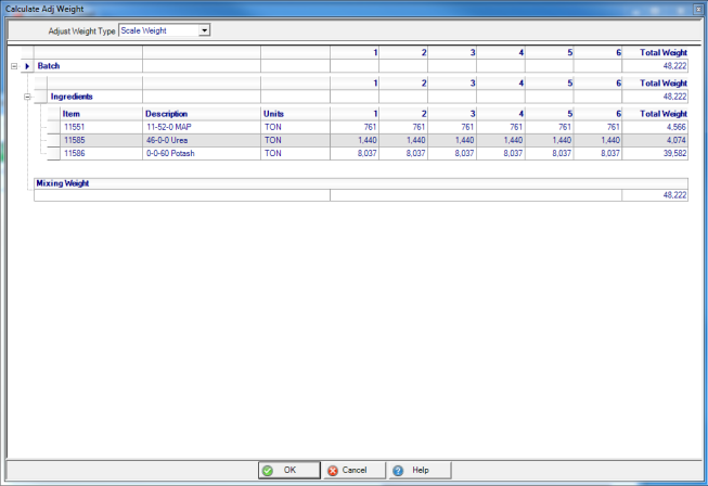 Use Calculate Adjust Weight to indicate what was actually used when mixing Fertilizer Batches.
