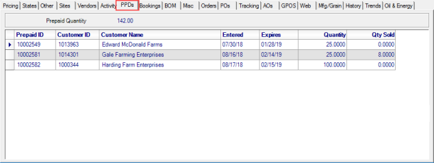 View a list of all Open Prepaids for an item which includes Customer Name, Quantity requested and Quantity Sold. See Access Open Prepaids for additional information.