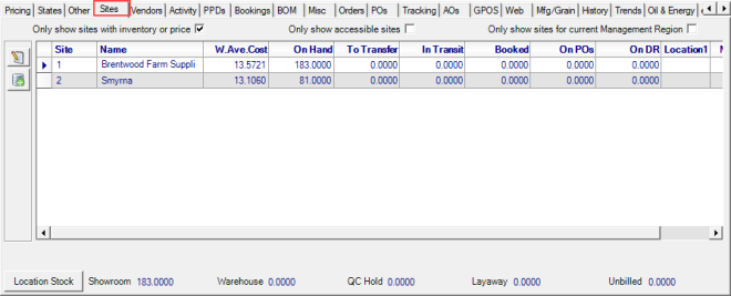 The Sites tab on Item Detail provides At-a-Glance quantity information regarding the Item at all Sites. Double click any Site to view and create Site specific information for the Item. The Site specific screen provides Inventory level fields for the Site and additional tabs to set Site Pricing, Site specific Fertilizer grade information and Lot tracking.