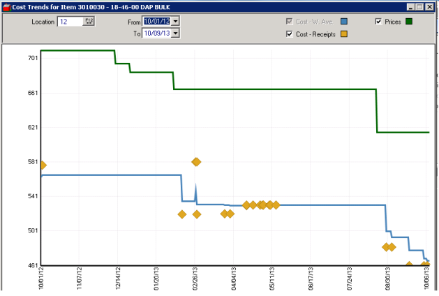 Select the Cost Trends button for a graphical representation of an items price versus Weighted Average Cost (WAC) at the selected site for a period. The diamonds represent transactions that change WAC if Cost-Receipts has been selected.