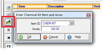 - For instance, Gramoxone is an ingredient on a chemical kit, has an application rate of 2 pounds per acre, and comes in a jug that weighs 4 pounds. When the chemical kit is added to the batch, a pop-up will ask for the number of acres. If you enter 100 acres, then 200 pounds would be needed, or 50 jugs. Thus, a quantity of 50 is added to the batch. Chemical kits are added to orders and batches by selecting the folder icon with the arrow.