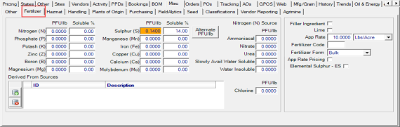 When the Fertilizer Ingredient checkbox has been selected in Item Details, this Fertilizer tab becomes active and will be used in fertilizer blending. Supply specific nutrient values, set the application rate and the fertilizer form.