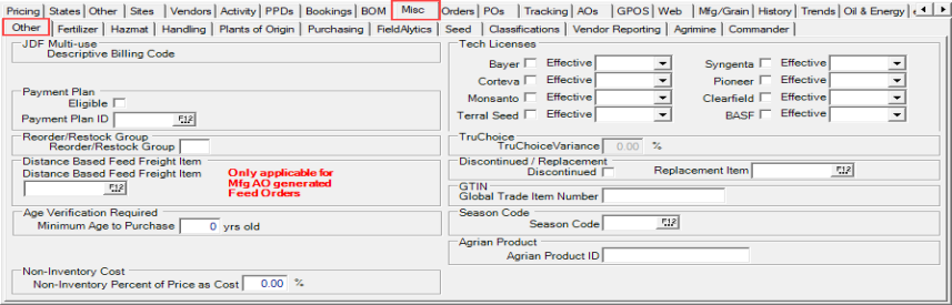 Select the Miscellaneous Other tab to View, Add and Edit additional relevant information regarding the item.