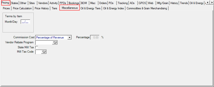 View, Add or Edit information relating to extended terms and commission on Pricing Miscellaneous.