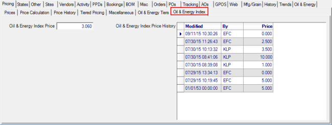 Oil & Energy Price History- View a History of the Oil & Energy Index price. The History includes the date and time the Index Prices was changed, The User ID of who changed the price and price entered.