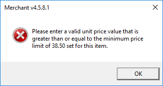 During Order Entry, if a price change is entered for an item it can be no lower than any Minimum Price set on an item. The warning message below will appear.