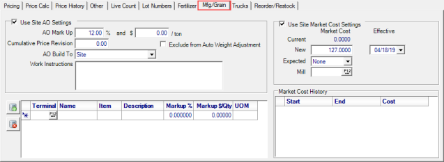 Set Feed items to use Site AO Settings and Site Market Cost Settings by using an Item's Sites tab and select the Mfg/Grain tab.